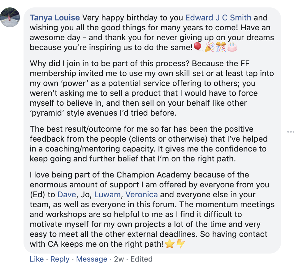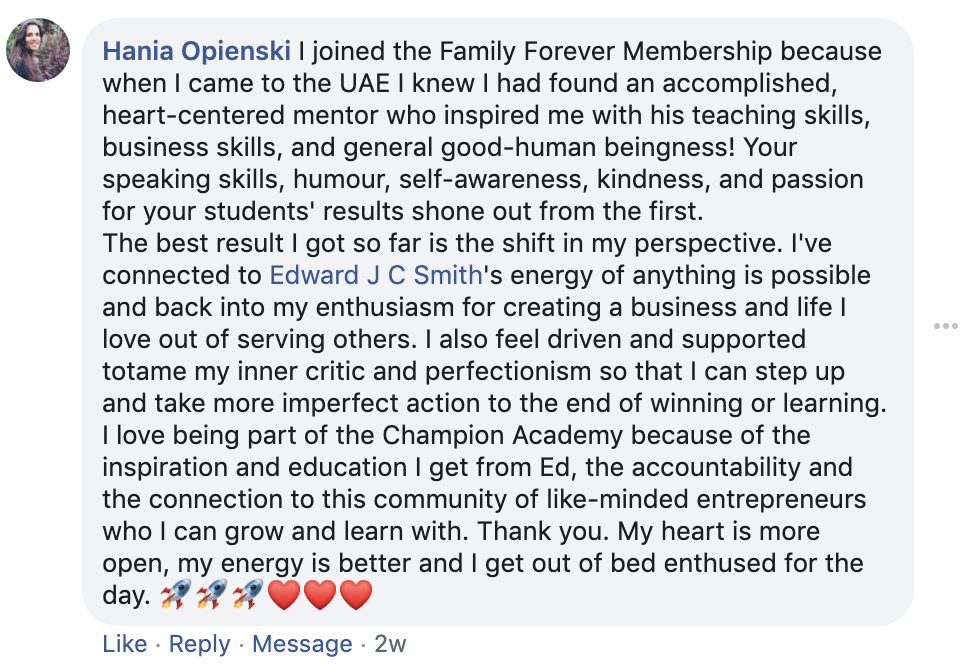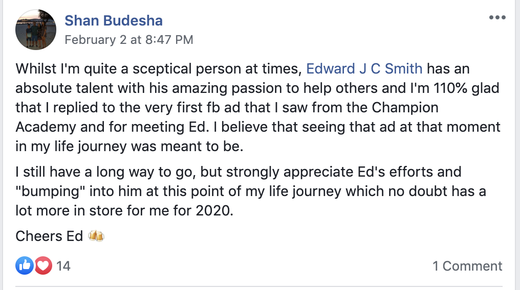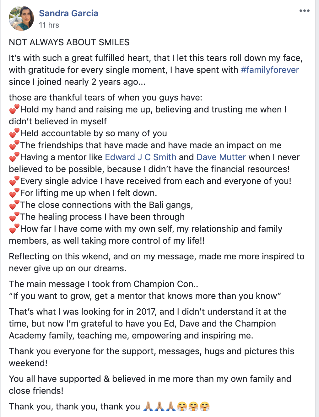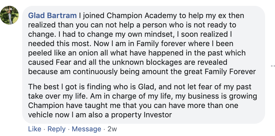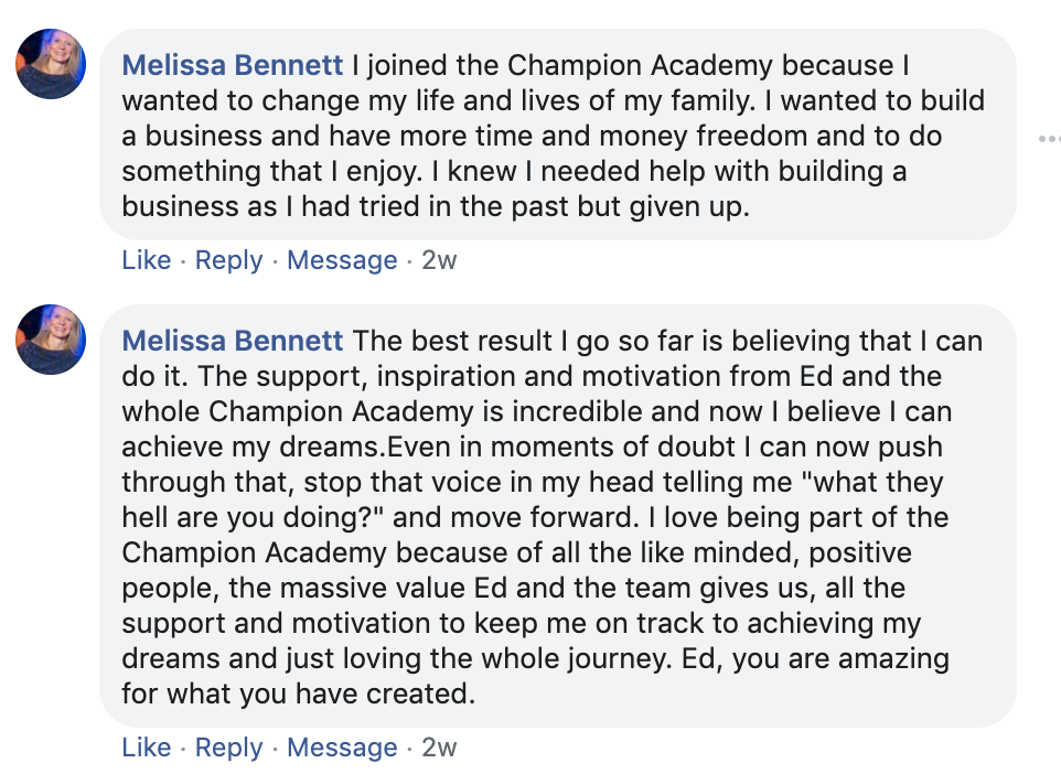 We don't believe in get-rich-quick programs. We believe in commitment, adding value and serving others, and that's what our programs are designed to help you do. As stated by law, we cannot and do not make any guarantees about your own ability to get results or earn any money with our ideas, information, programs or strategies. We don't know you and, besides, your results in life are up to you. Agreed? We're here to help by giving you our greatest strategies to move you forward, faster. However, nothing on this page or any of our websites or emails is a promise or guarantee of future earnings. Any financial numbers referenced here, or on any of our sites or emails, are simply estimates or projections or past results, and should not be considered exact, actual or as a promise of potential earnings - all numbers are illustrative only. Not all results are typical. If you have questions, email info@championacademy.co.uk. We believe integrity and honesty are of the upmost important in life.